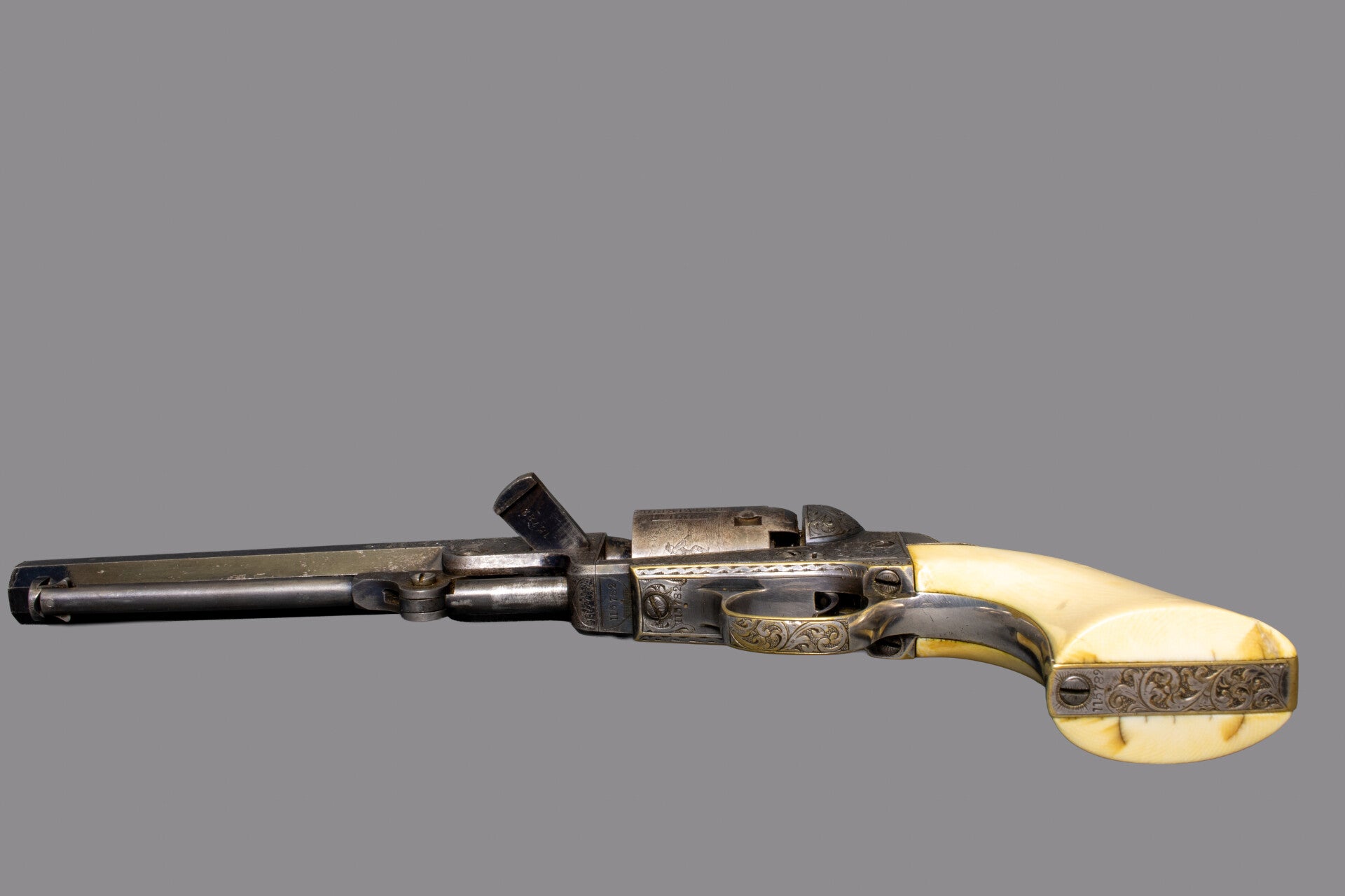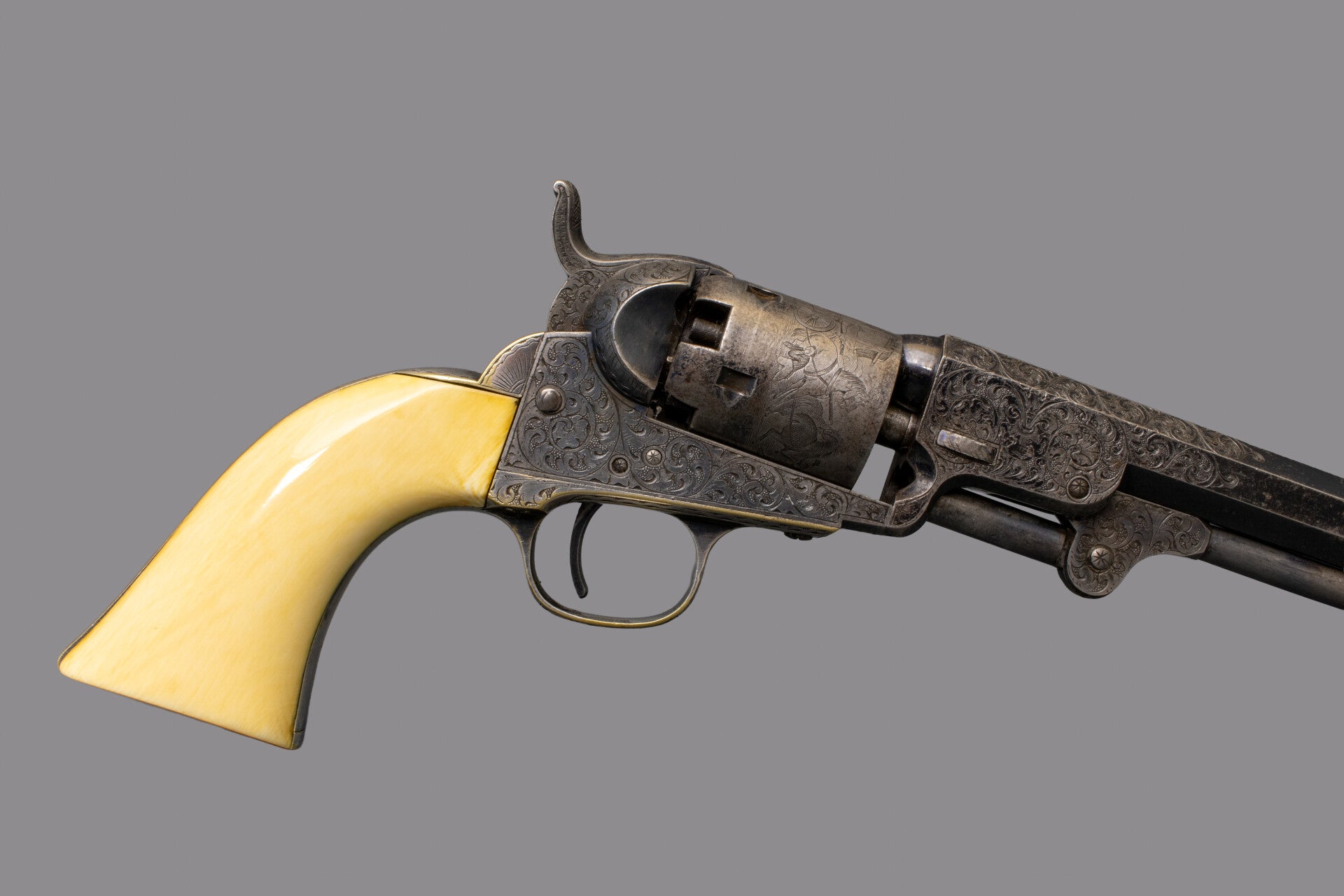 This revolver was manufactured in 1856 and selected for engraving by the factory as indicated by the "." (dot) by the main serial number locations. The engraving matches others known by Master Engraver Gustave Young, note particularly the use of a dog’s head amongst the scrollwork on the left by the wedge and the wolf head pattern on the hammer. The traditional scrollwork throughout is of course also his style and is backed by finely textured punch dot backgrounds and accented by border, shell, and floral motifs. The hammer has 4 dots, and number 6, stamped that indicate the amount of time dedicated to engraving them, often seen on Gustave Young engraved guns. The 6 inch barrel has a dovetail blade front sight and has have an engraved “SAML COLT” address. Left side of frame is engraved in a ribbon “COLTS PATENT”. The trigger guard is silver plated brass, as is the backstrap which holds a one-piece Factory Ivory grip, the serial number is very lightly visible in the backstrap channel. The Ivory grip has a hairline-crack on the left side which is nothing serious. Frame and recoil shield have full coverage deluxe engraving by Gustav Young, consisting of intertwined foliate arabesque patterns with punch dot background and several scrolls terminating in blooming flowers. The engraving extends over the barrel lug and onto the rammer pivot plate and the wavy line borders on the barrel lug faces are part of extra grade of decoration that is denoted by the small dots near each serial number; guns so marked would get special attention from the engraving and finishing rooms. A single scroll on the right-hand side finishes in a Mr. Young’s trademark dogs head. Top side flats of the octagonal barrel are engraved to match, tapering out after the pivot, the barrel crown has a simple border pattern. The upper portion of the back strap has Mr. Young’s distinctive fan motif with more folate patterns down the back strap, butt strap and trigger guard while the front strap remains clear of engraving. All screw heads and pins are engraved with star bursts and appear finished with Colt’s fire blue, except for the hammer screw which is left plain. The five shot cylinder is roll marked with a Stagecoach holdup scene with Colt’s Patent marking and matching serial number; all five cylinder nipples and safety pins are in good order. The barrel, wedge, rammer, frame and hammer retain visible case colors. The cylinder has a blue / gray finish. The trigger guard and backstrap retains almost all of its silver plating. Mechanically the gun is in fine working order with a strong mainspring and timed cylinder rotation. The bore exhibits strong rifling and is nice and shining.