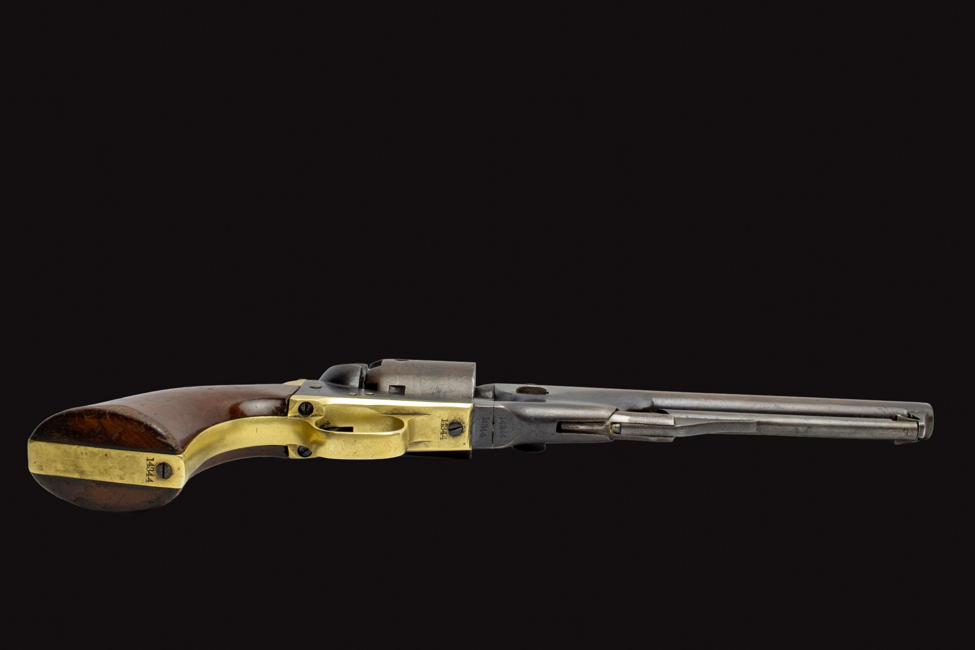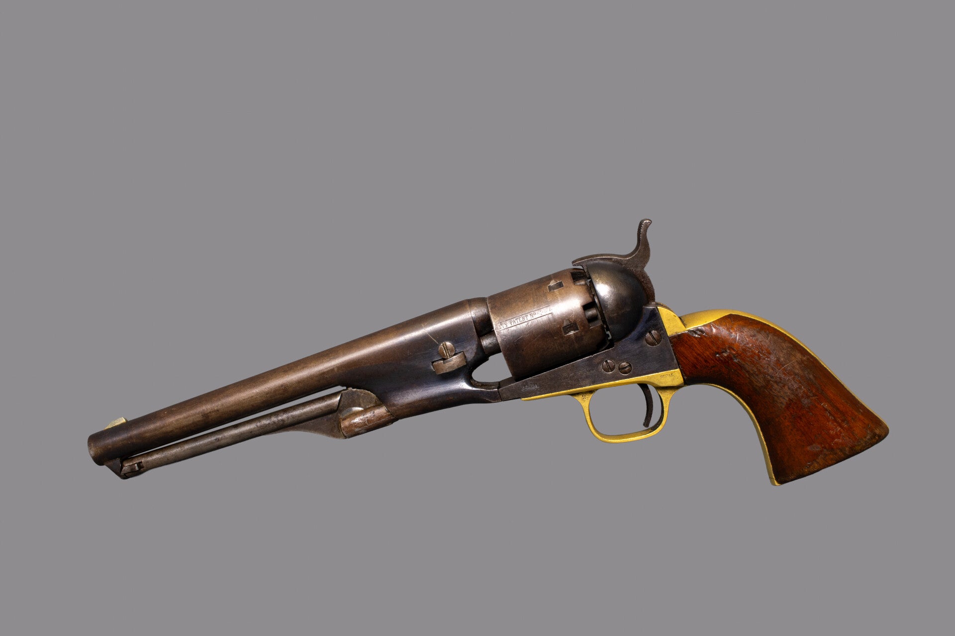 During 1862 exactly 2,000 of the pistols were delivered directly from Colt to the Ordnance Department, with an additional 56 being procured in 1863. The first of 1862 deliveries were made on February 17 and the last on April 2. These were the only revolvers of this pattern to receive military inspection marks. Other documented US military purchases of the “New Model Navy" include 307 that were procured from Joseph C. Grubb & Company of Philadelphia, PA, and 2,400 acquired from B. Kittredge & Company of Louisville, KY. None of these guns were inspected and marked. The US Navy also purchased some 3,370 “New Model Navy" revolvers during the war, but according to most researchers most of the guns underwent no specific inspection and were left unmarked. Unlike the “Old Model Navy" revolvers (Model 1851), the military inspected “New Model Navy" pistols were not marked U.S. on the frame under the COLTS / PATENT but were simply marked with the usual single letter sub-inspection stamps on most of the individual components, and often with an inspectors’ cartouche on the left side of the one-piece walnut grip.