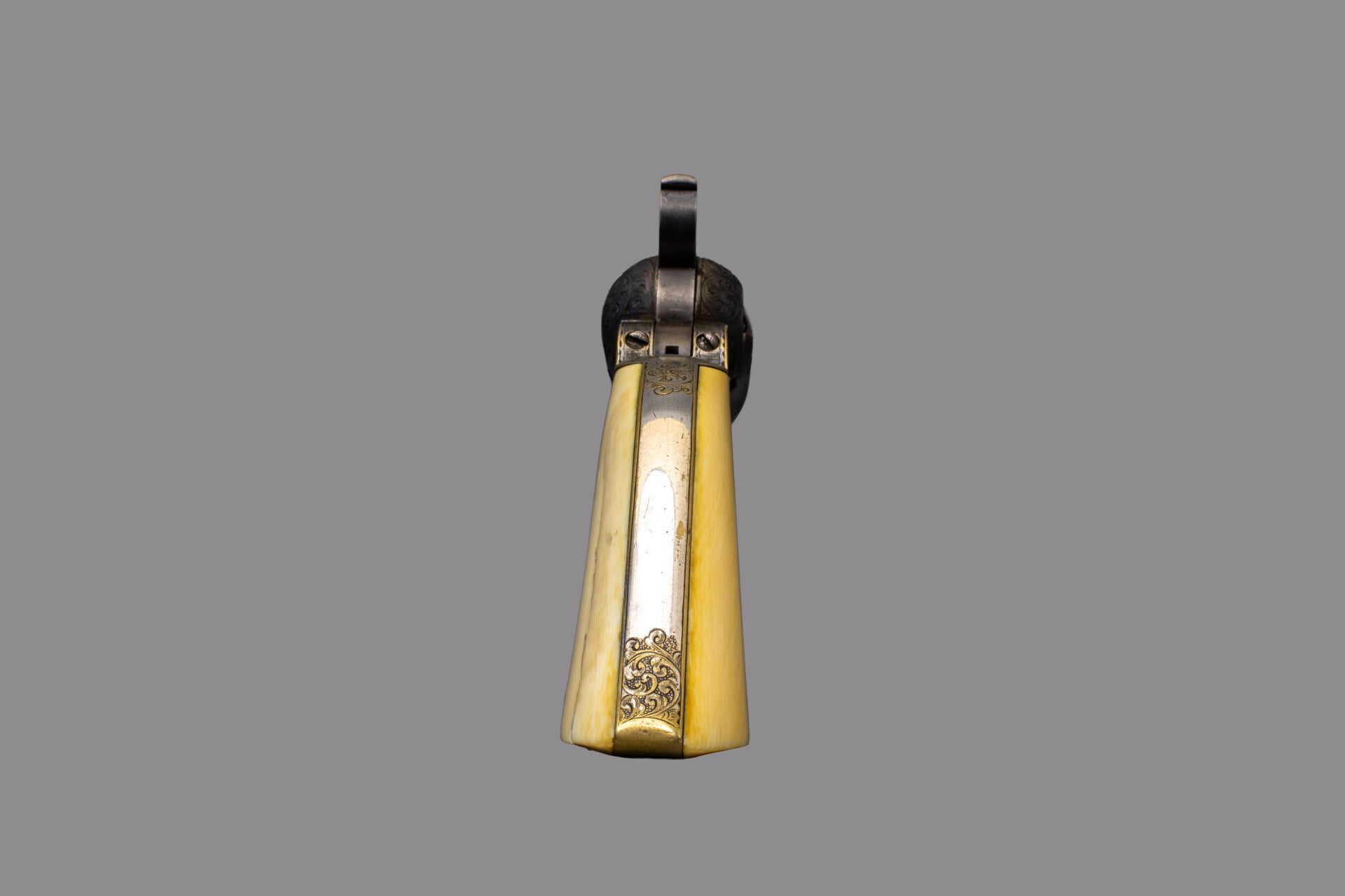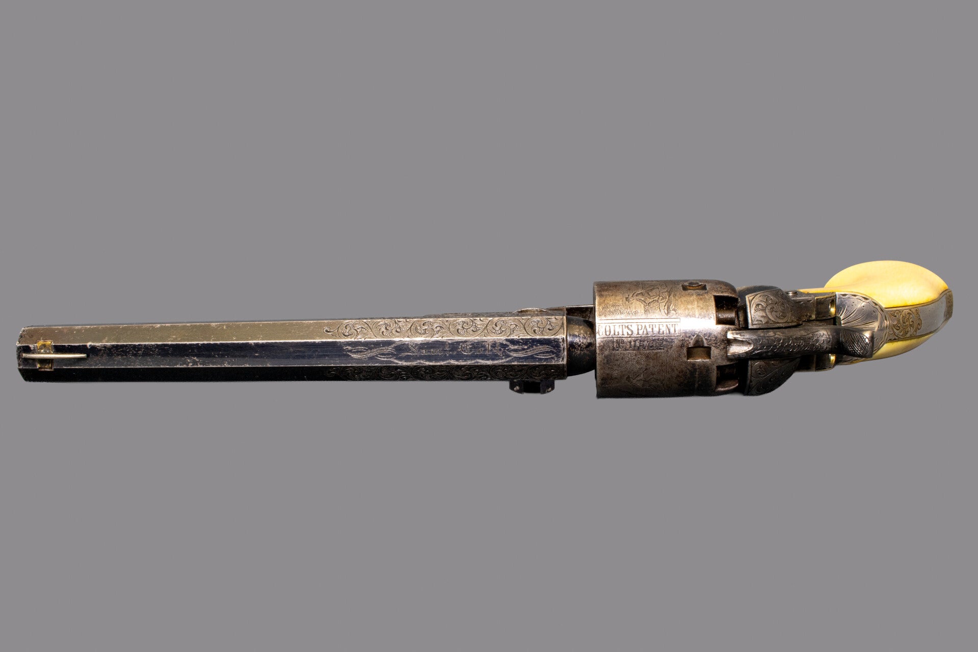 This revolver was manufactured in 1856 and selected for engraving by the factory as indicated by the "." (dot) by the main serial number locations. The engraving matches others known by Master Engraver Gustave Young, note particularly the use of a dog’s head amongst the scrollwork on the left by the wedge and the wolf head pattern on the hammer. The traditional scrollwork throughout is of course also his style and is backed by finely textured punch dot backgrounds and accented by border, shell, and floral motifs. The hammer has 4 dots, and number 6, stamped that indicate the amount of time dedicated to engraving them, often seen on Gustave Young engraved guns. The 6 inch barrel has a dovetail blade front sight and has have an engraved “SAML COLT” address. Left side of frame is engraved in a ribbon “COLTS PATENT”. The trigger guard is silver plated brass, as is the backstrap which holds a one-piece Factory Ivory grip, the serial number is very lightly visible in the backstrap channel. The Ivory grip has a hairline-crack on the left side which is nothing serious. Frame and recoil shield have full coverage deluxe engraving by Gustav Young, consisting of intertwined foliate arabesque patterns with punch dot background and several scrolls terminating in blooming flowers. The engraving extends over the barrel lug and onto the rammer pivot plate and the wavy line borders on the barrel lug faces are part of extra grade of decoration that is denoted by the small dots near each serial number; guns so marked would get special attention from the engraving and finishing rooms. A single scroll on the right-hand side finishes in a Mr. Young’s trademark dogs head. Top side flats of the octagonal barrel are engraved to match, tapering out after the pivot, the barrel crown has a simple border pattern. The upper portion of the back strap has Mr. Young’s distinctive fan motif with more folate patterns down the back strap, butt strap and trigger guard while the front strap remains clear of engraving. All screw heads and pins are engraved with star bursts and appear finished with Colt’s fire blue. The five shot cylinder is roll marked with a Stagecoach holdup scene with Colt’s Patent marking and matching serial number; all five cylinder nipples and safety pins are in good order. The barrel, wedge, rammer, frame and hammer retain visible case colors. The cylinder has a blue / gray finish. The trigger guard and backstrap retains almost all of its silver plating. Mechanically the gun is in fine working order with a strong mainspring and timed cylinder rotation. The bore exhibits strong rifling and is nice and shining.